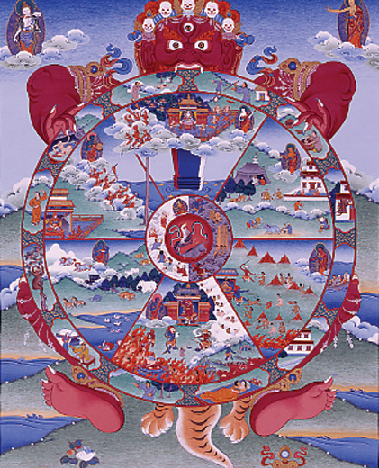 The Wheel of Cyclic Existence This is the Buddhist representation of Samsara the self-perpetuating process of delusion and suffering. This is the fundamental doctrine of Buddhist teaching and all the Buddism (either Mahayana, Hinayana, Sutra or Tantra) are accepting this as a principle.