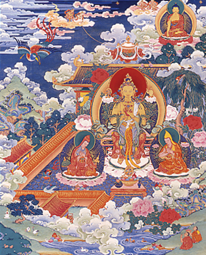 Here he isaccompanied by Atisha on the left and Tsong Khapa on the right.